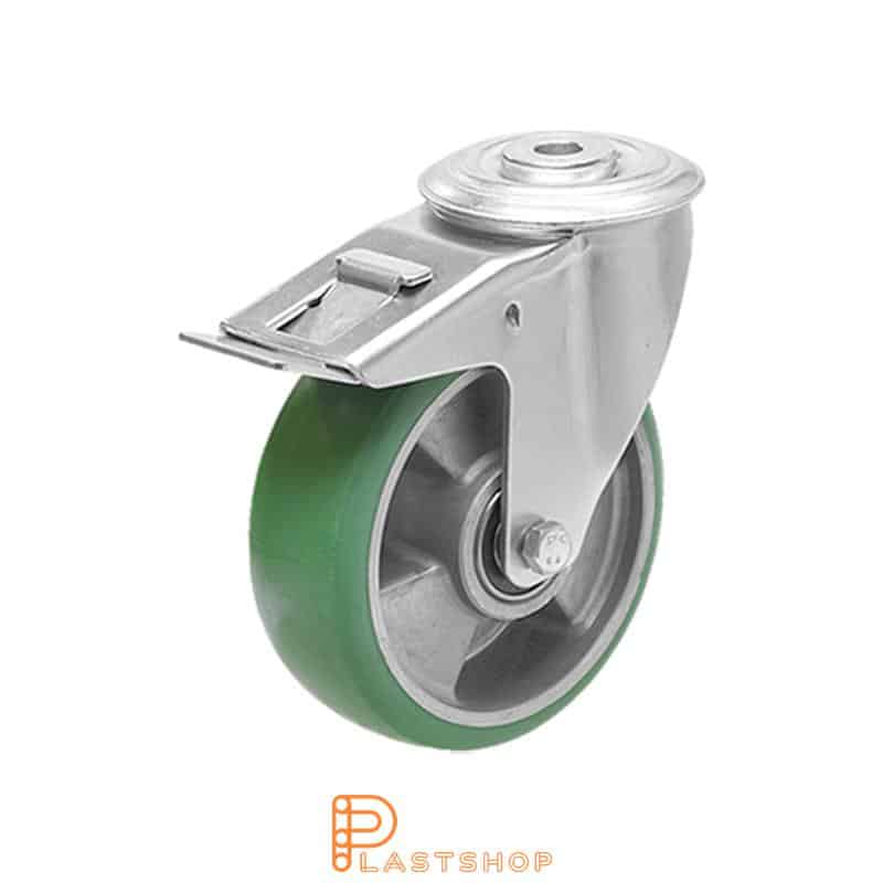 Bromsat länkhjul, eller svängbart hjul med broms, med en bygel tillverkad av pressad plåt. Dubbla kullager i hjulet som har en diameter på 100 mm och en banbredd på 40 mm. Navet är tillverkat av aluminium och banan är ElastoPUR med en hårdhet på 83° Shore A och är i grön färg. Länkhjulet fästs med centrumhål (centrumhålets diameter är 13 mm). Den totala bygghöjden är 128 mm och den totala bärigheten är 180 kg. Länkhjulet är utrustat med en totalbroms som innebär att både hjulet och vridkransen låsas vid ett tryck på pedalen, och är att anse som den säkraste typen av bromsar. Naturligtvis uppfylls också villkoren enligt RoHS (Restriction of Hazardous Substances). Hjulet är testat och klarar temperaturer från -20°C till +70°C. Du hittar mer information om hjulets plastmaterial på vår sida med teknisk dokumentation. Önskar du en 3D-ritning ber vi dig ta kontakt med oss direkt. Önskar du lagerstatus eller pris anger du antalet och klickar på knappen ”Begär pris”.