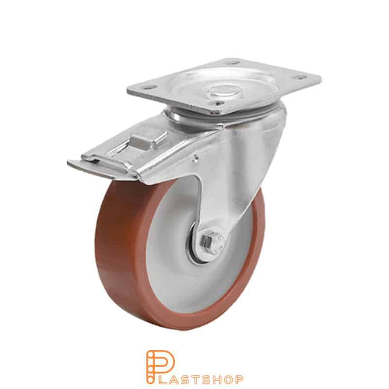 Bromsat länkhjul, eller svängbart hjul med broms, med en bygel tillverkad av pressad plåt. Dubbla kullager i hjulet som har en diameter på 100 mm och en banbredd på 40 mm. Navet är tillverkat av PA6 och banan är PUR med en hårdhet på 98° Shore A och är i röd färg. Länkhjulet fästs med platta (storlek på platta är 105×85 mm och hålen har CC 80×60 mm). Den totala bygghöjden är 130 mm och den totala bärigheten är 300 kg. Länkhjulet är utrustat med en totalbroms som innebär att både hjulet och vridkransen låsas vid ett tryck på pedalen, och är att anse som den säkraste typen av bromsar. Naturligtvis uppfylls också villkoren enligt RoHS (Restriction of Hazardous Substances). Du hittar mer information om hjulets plastmaterial på vår sida med teknisk dokumentation. Önskar du en 3D-ritning ber vi dig ta kontakt med oss direkt. Önskar du lagerstatus eller pris anger du antalet och klickar på knappen ”Begär pris”.